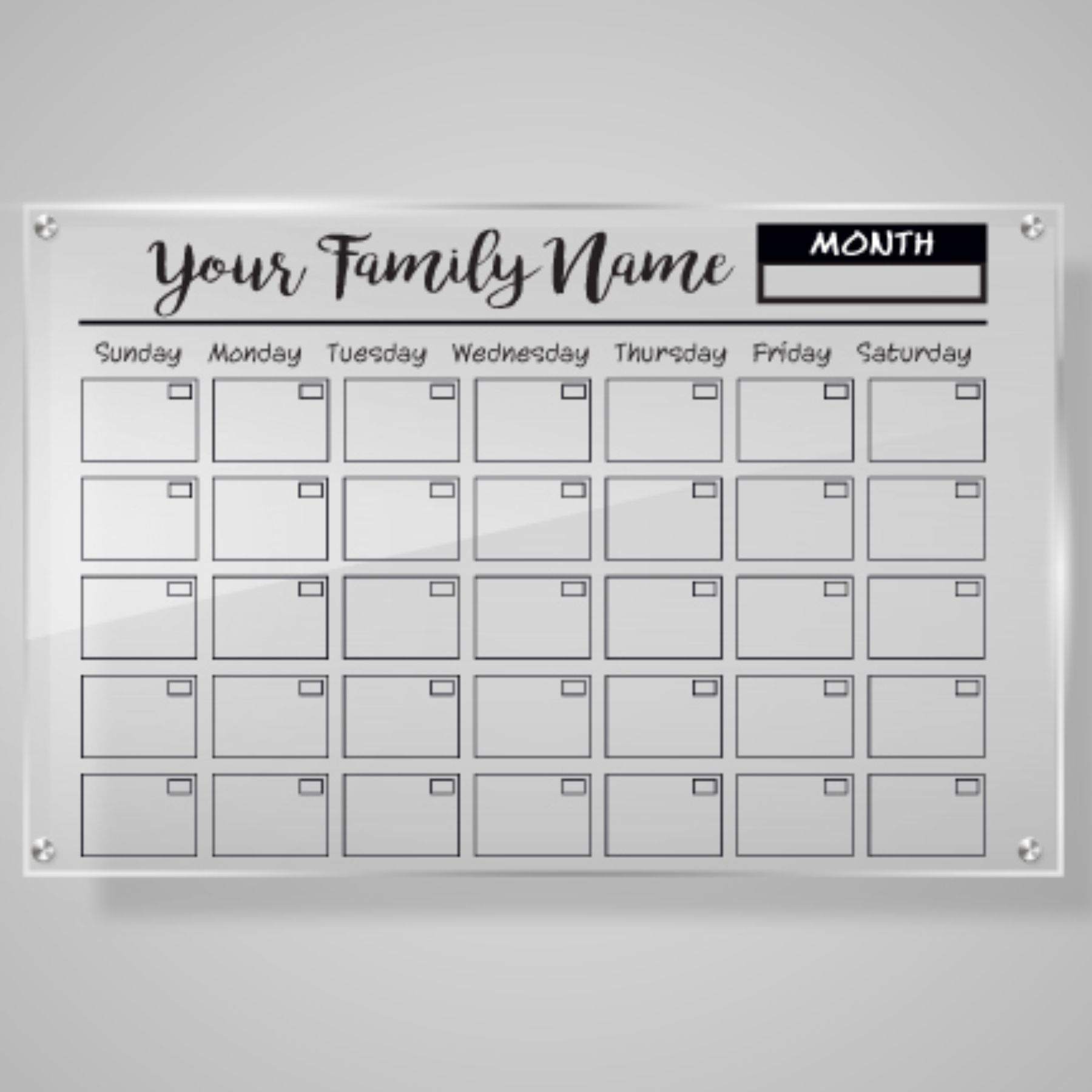 24″ x 18″ Clear Acrylic Calendar. Custom Family name.