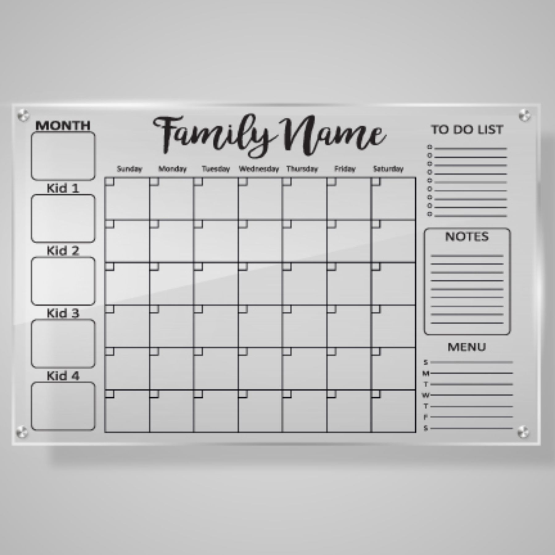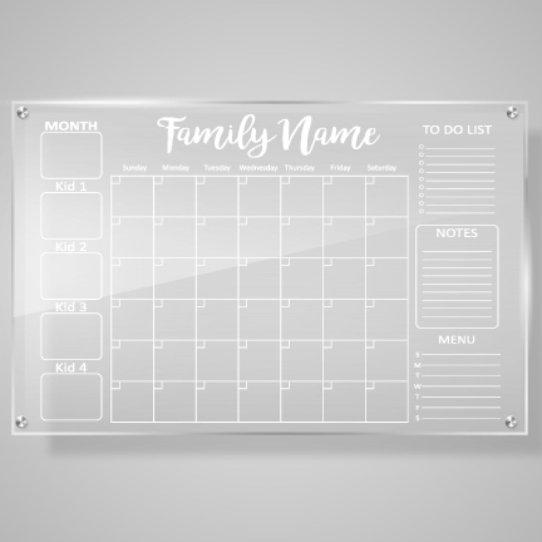24″ x 18″ Clear Acrylic Calendar. Custom Family name with space for kids, notes, to-do list, and menu.