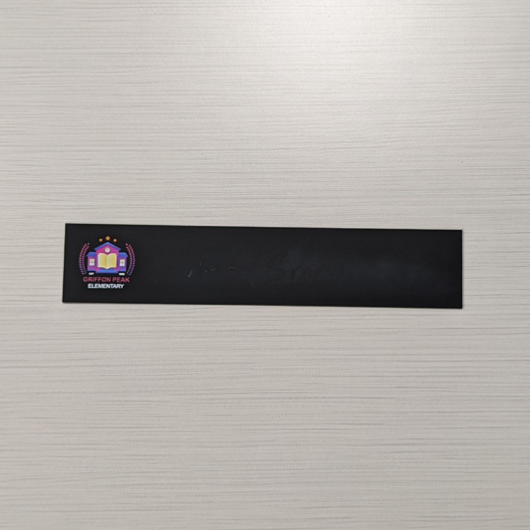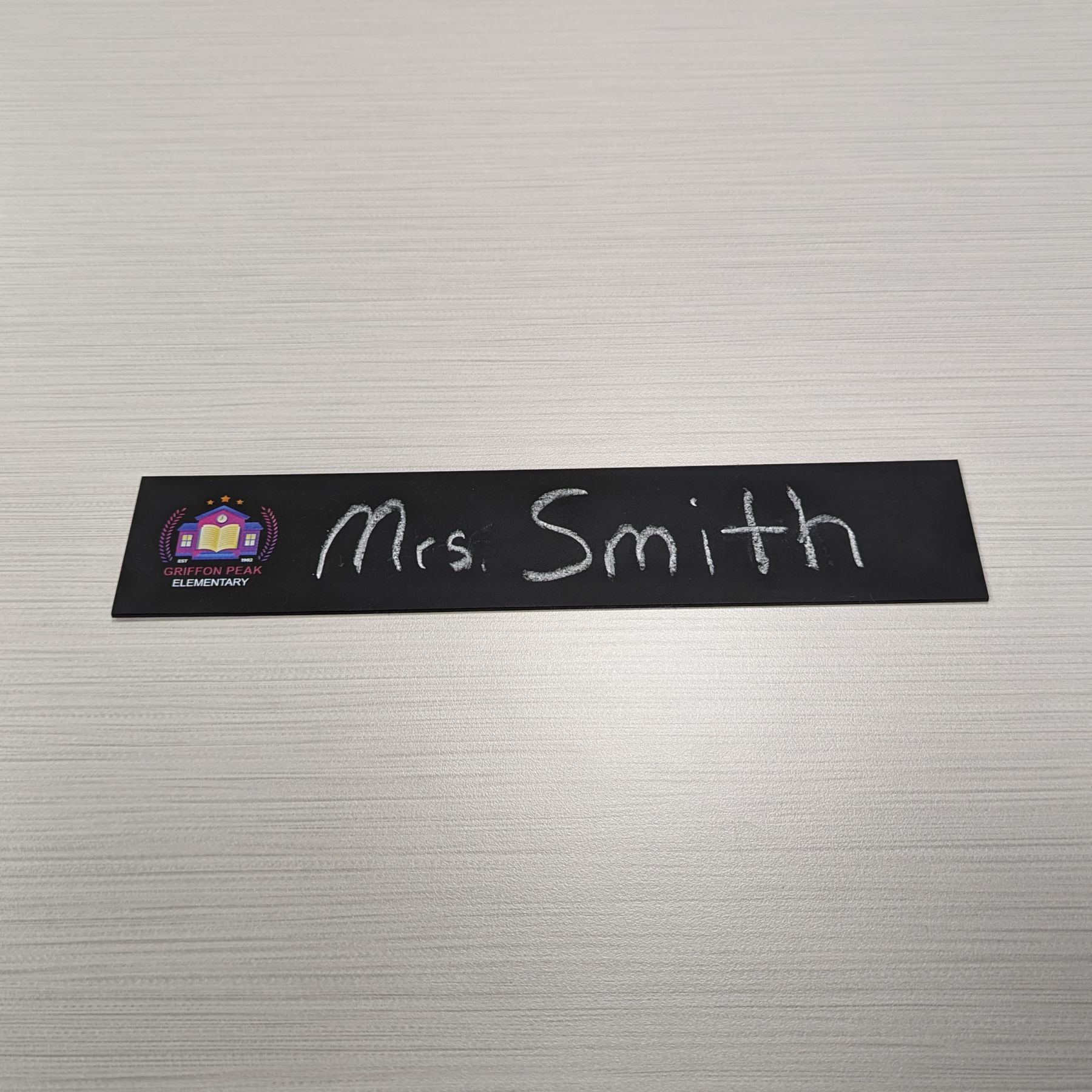 10″ x 2″ Chalkboard name plates with logos printed in color – write-on and reuse.