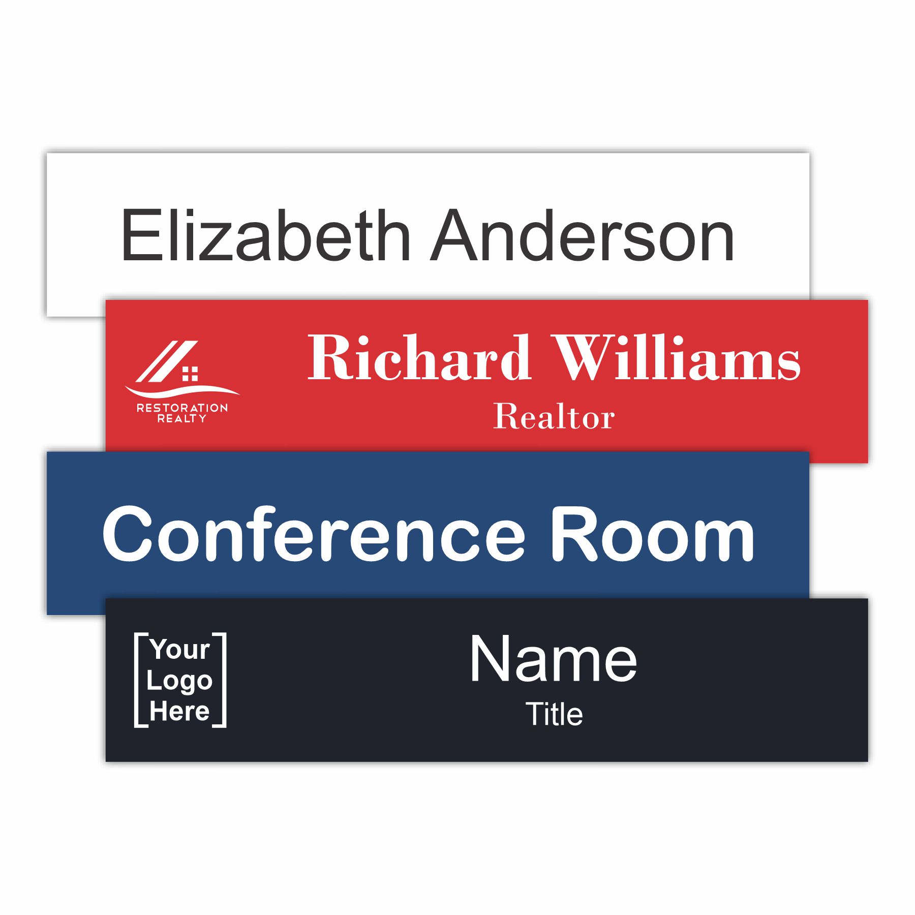 Personalize these name plates for employees or for signs around the office. Great for desks, doors, lobbies and directional signs.