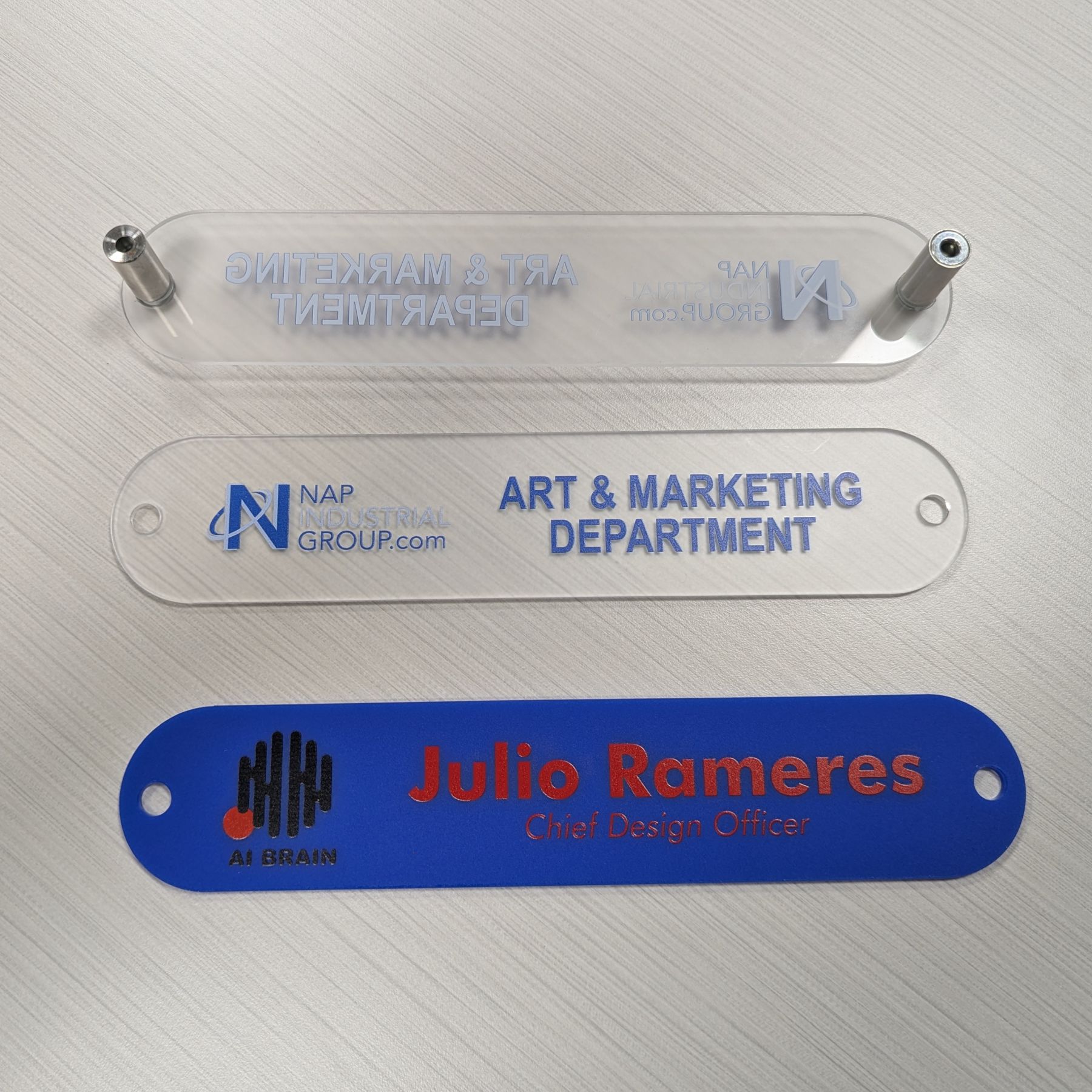 Full-color printing is vibrant, scratch resistant and eye-catching! Customize these name plates with your logo, graphics, text and nearly anything for a branded, professional sign.