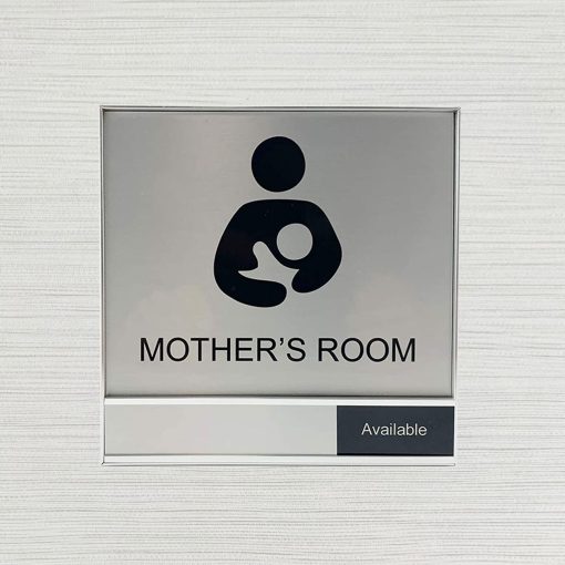 Framed Mother’s Room Sign is the ideal way to show that a nursing room is available or in use. Made of durable aluminum, this 6″ x 6″ sign will attach to any wall or door by applying the easy-to-use adhesive strips to the back of the sign. Sign features a plate that slides back and forth, displaying if the room is “available” or “in use.”