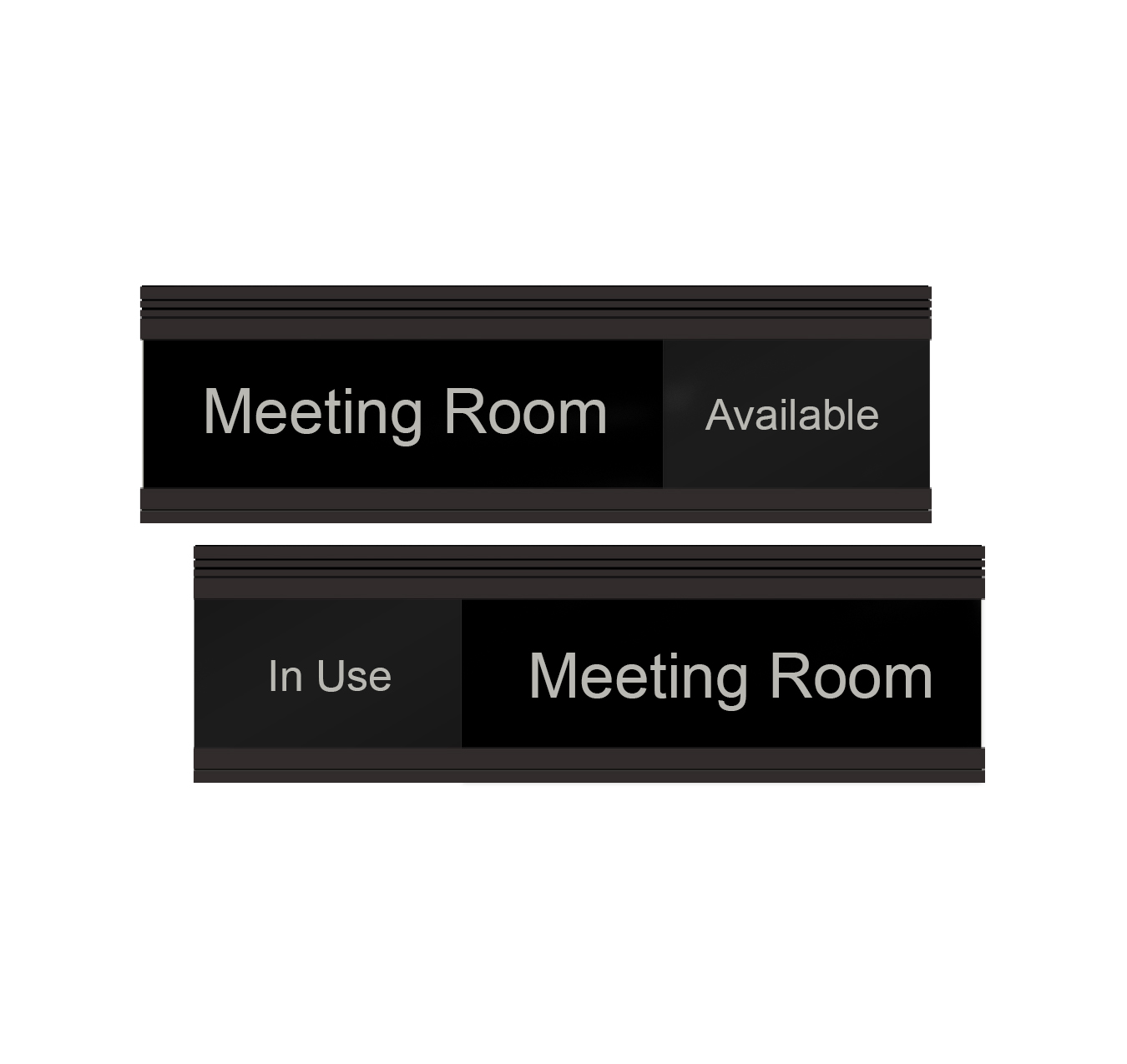 Sleek, black slider signs for meeting rooms have a top sign that slides to easily reveal if the room is “Available” or “In Use”.