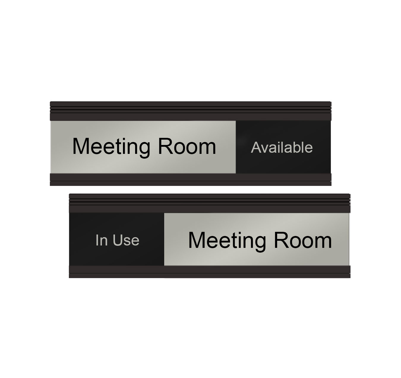 Durable, stylish office slider signs for meeting rooms have a top sign that slides to reveal the status of the room.