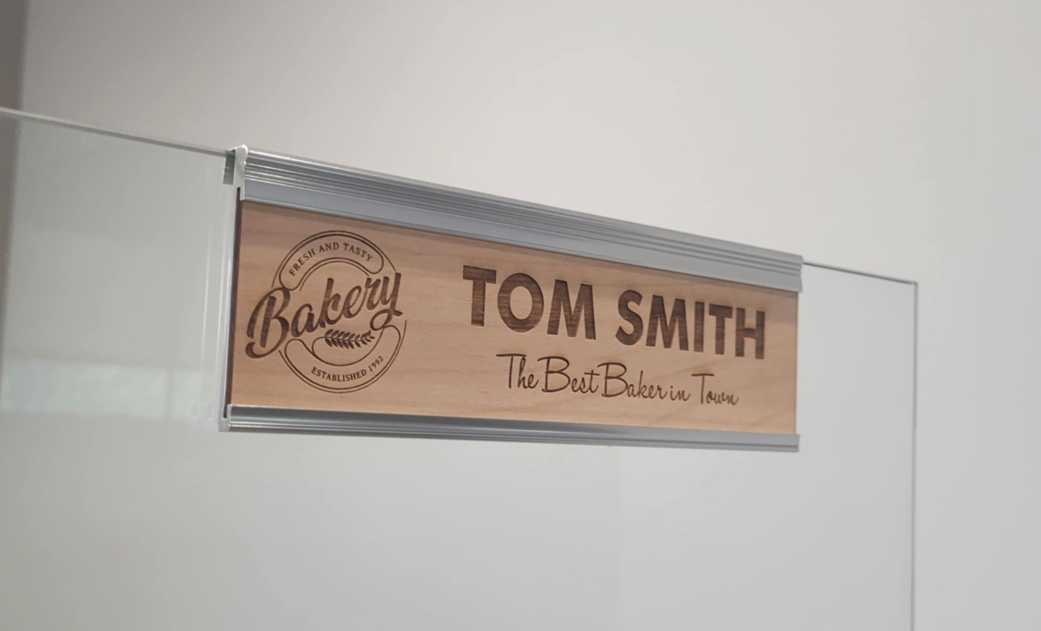 Custom Alderwood nameplate signs with laser-engraved names and logos.